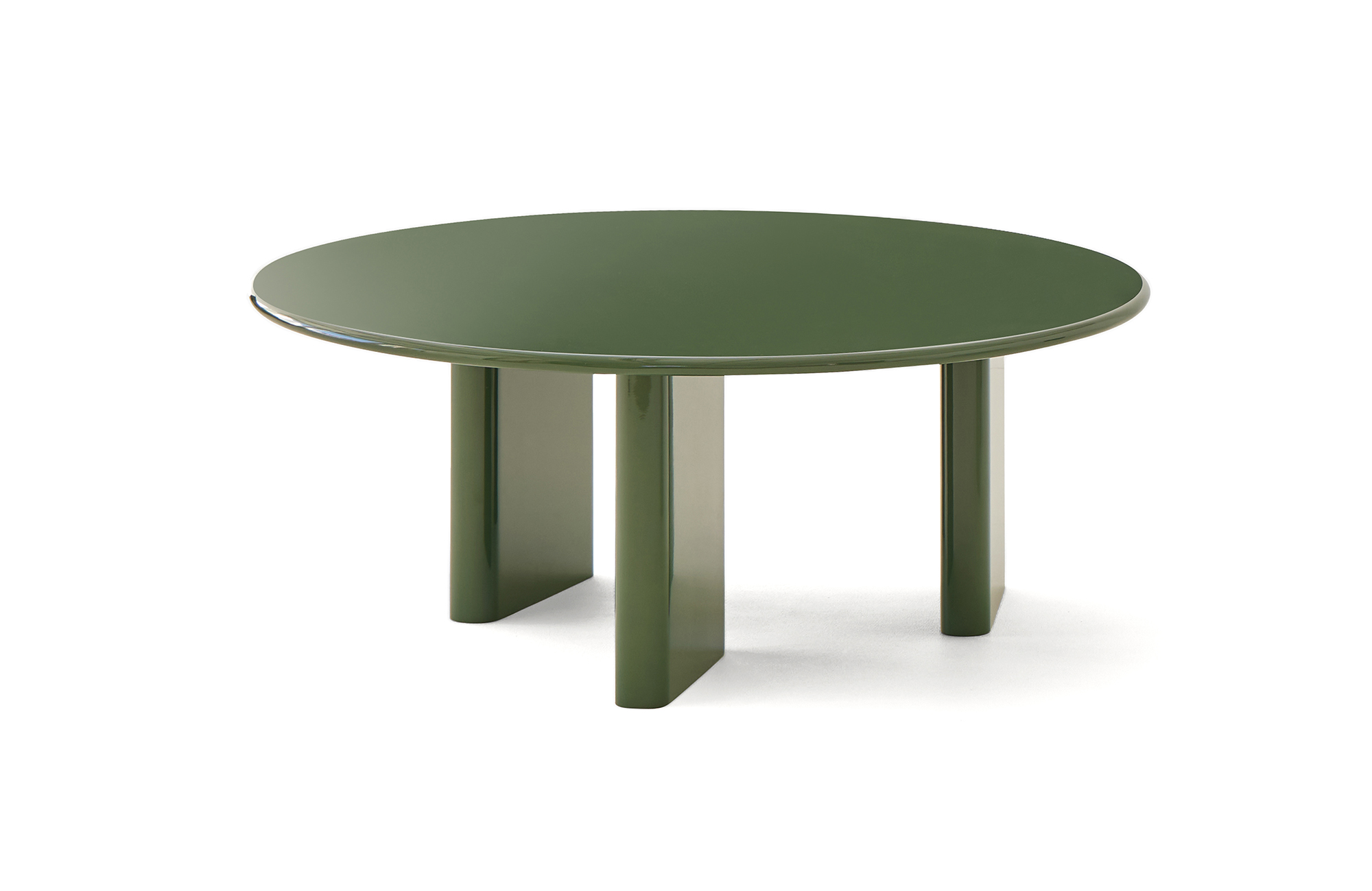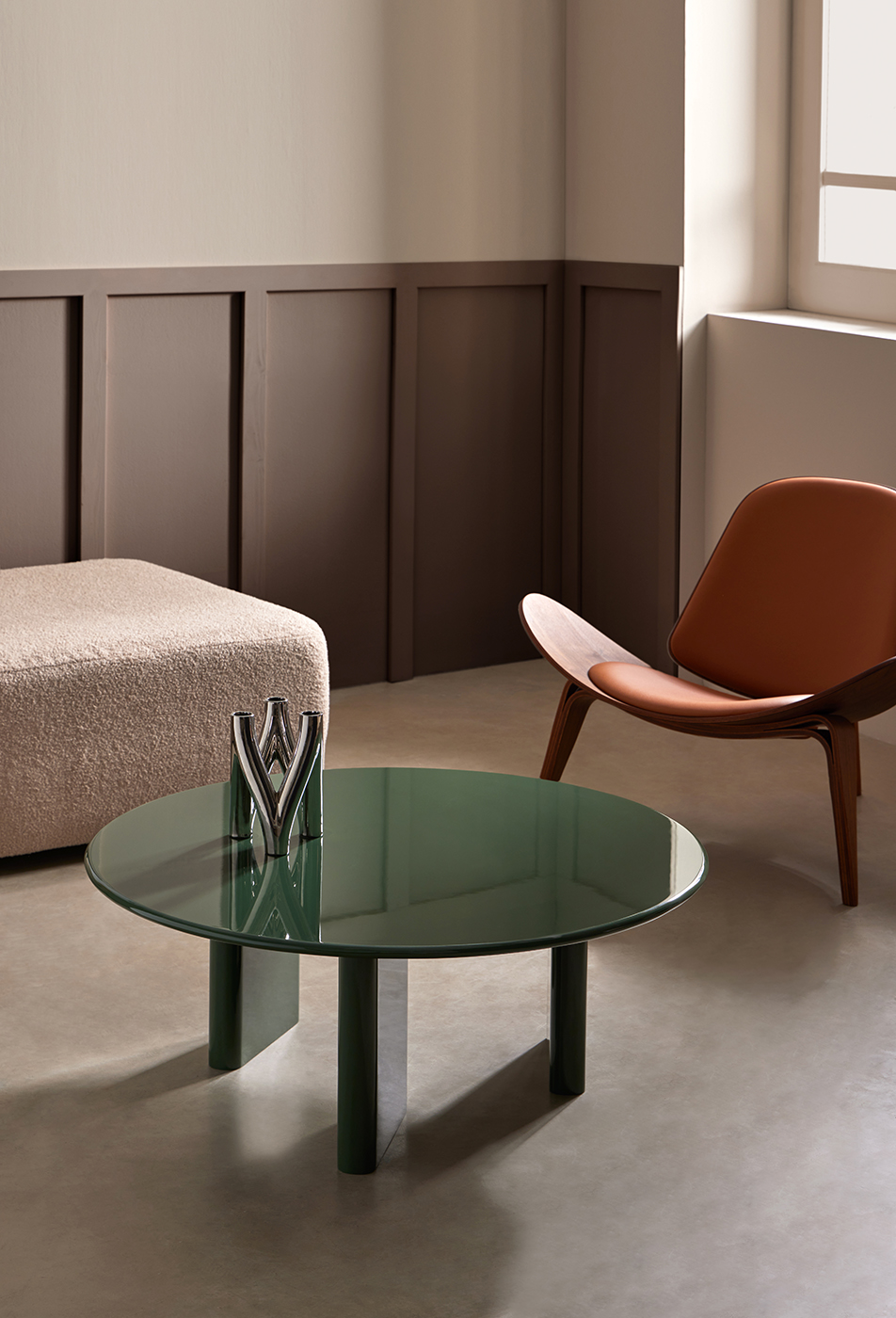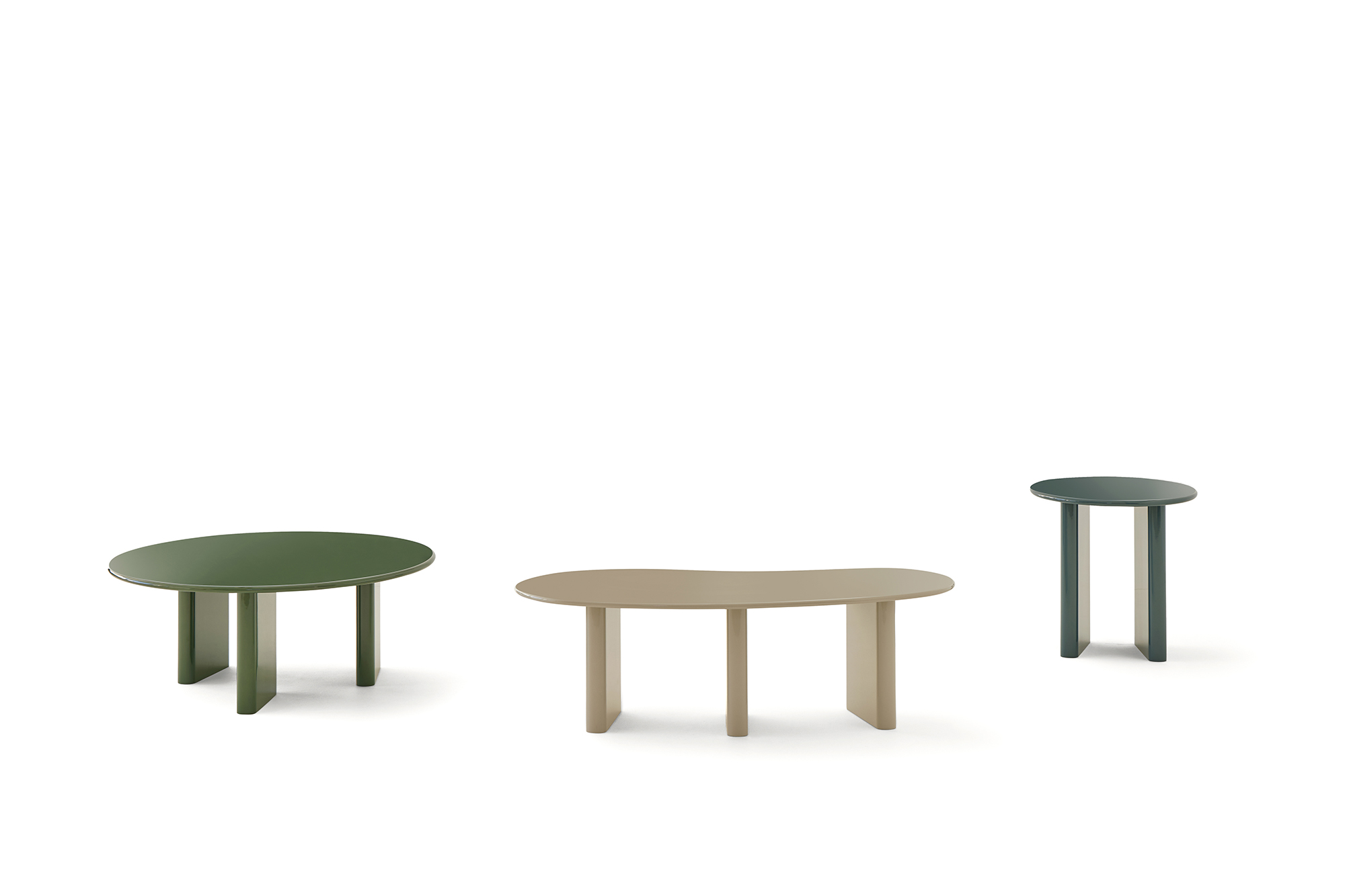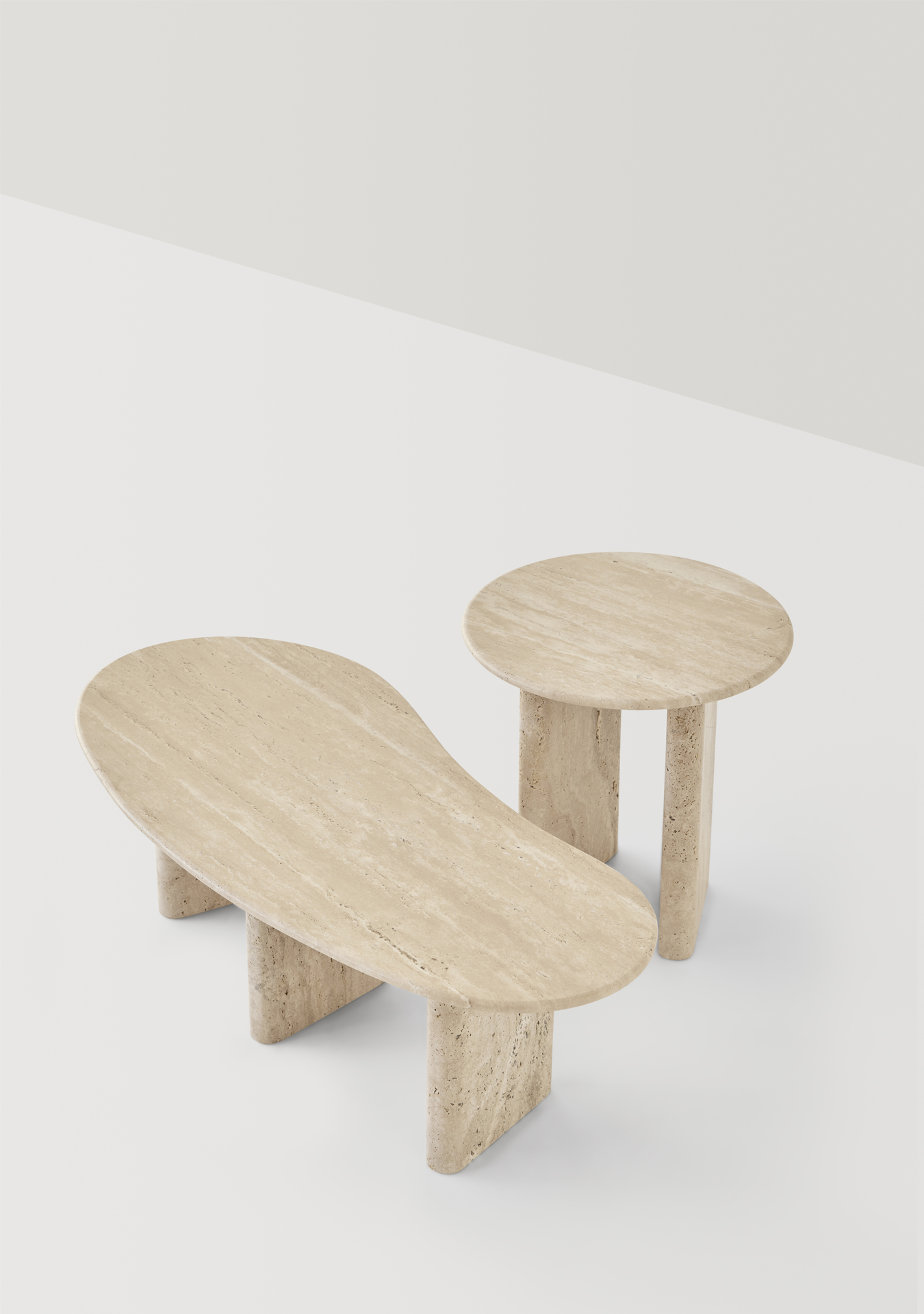 This collection encompasses two distinct models, constituting a duo of varying heights. The low table boasts a top with an artfully asymmetrical composition, while its base exudes a robust and voluminous presence, infusing dynamism into the ensemble. Conversely, the high table features a circular top and an angled base, harmoniously employing the same module as its counterpart, thus fostering visual and stylistic coherence throughout the collection.